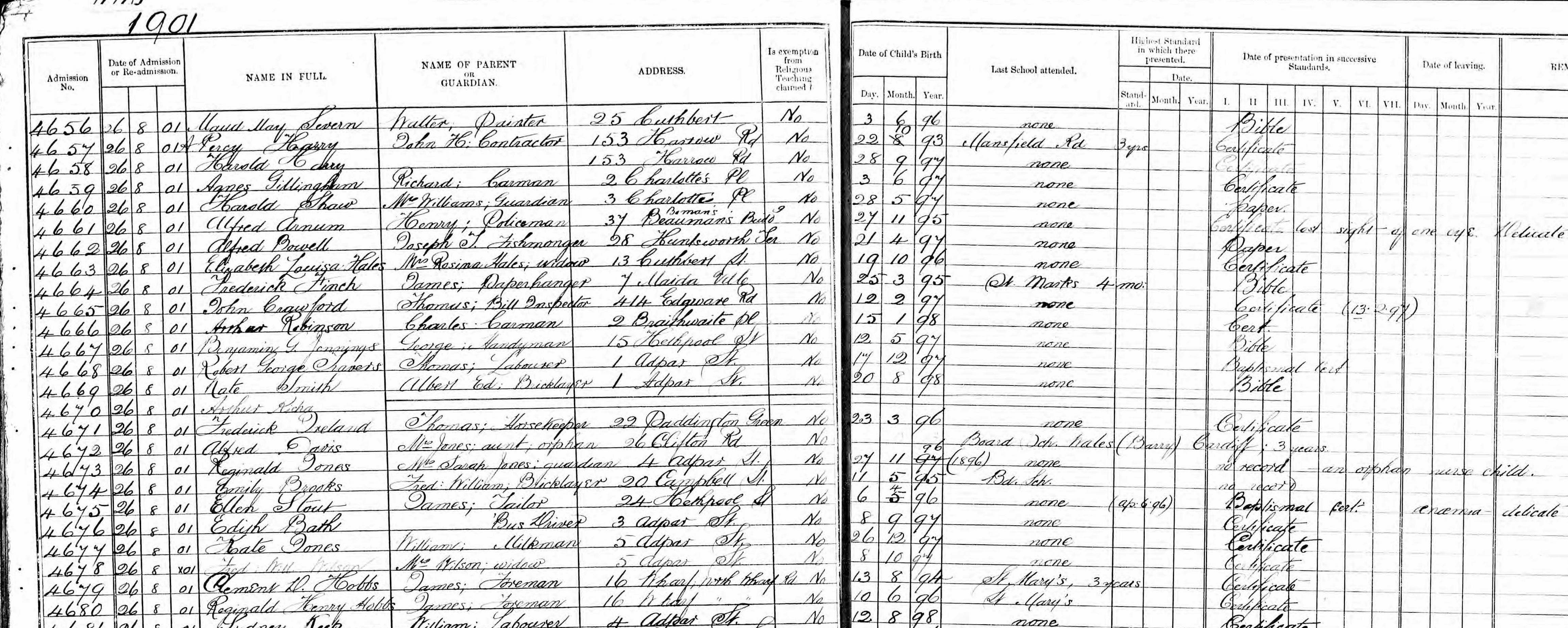 Campbell Street School Admissions Record August 1901 - Clem is third entry from the bottom - it also states that he was at St Mary's prior to that for three years