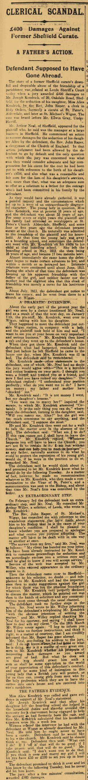 For the plaintiff, Mr John Kendrick, it was stated that the plaintiff's family were worshippers at St Peters Church, Abbeydale, Sheffield and some four or five years ago the defendant who was then about 28 became curate at that church. He was admitted into the friendship of Mr Kendrick's household. At the time the girl Alice was away at a boarding school. She left school in May 1912, and she was then 16 years of age, becoming 17 two months later. Almost immediately she came home the defendant began making advances to her, and a month or two later he seduced her. the girl who was quite a child, made what resistance she could. Familiarity occurred on a number of other occasions, the last time about June 1913. The whole of this time the defendant was keeping up an apparent friendship with the father of the girl, and her parents did not have the slightest idea of what was going on. In July 1913 he got notice to leave his curacy and went to a church in Wigan.