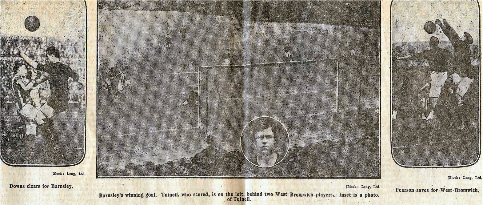The middle photo shows Harry Tufnell scoring the winning goal for Barnsley - he is on the left just behind the two West Bromwich defenders
