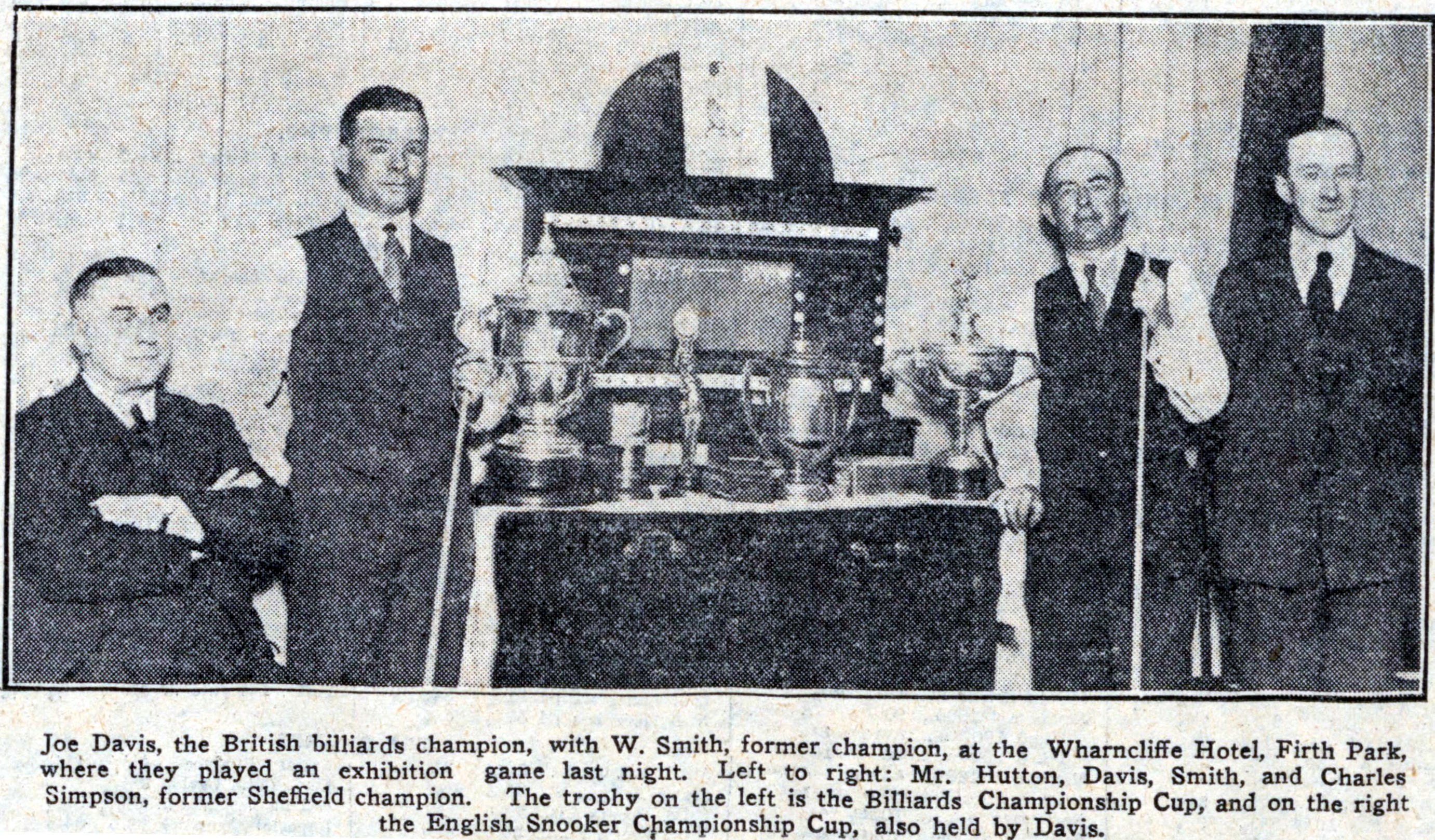 In 1921 he was a member of the Committee that founded the Sheffield Billiards Association and in the following year became the Sheffield Amateur Billiards Champion. He retained the title in 1923. However due a dispute with regard to his amateur status he was refused entry to the English Amateur Billiards Championship. The dispute dragged on for a couple of years before he was finally admitted as an amateur. He again won the Sheffield Amateur Billiards Championships in 1926 and 1927 but shortly after the latter victory he decided to turn professional. As far as I can ascertain the reason for the change was that billiards and snooker were becoming a full time occupation. the change must have agreed with him for in 1928 he made his record billiard break of 616 at the family's billiard saloon La Plata.
