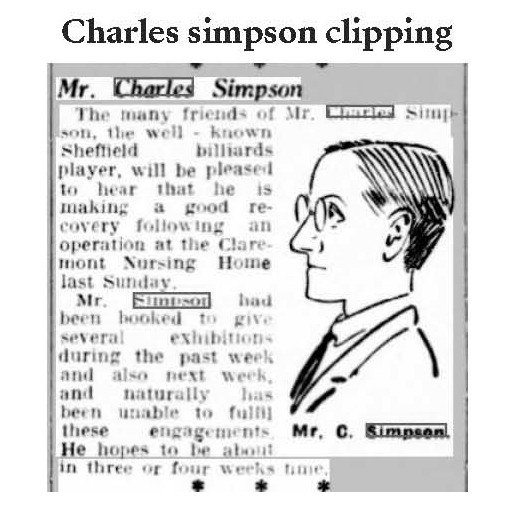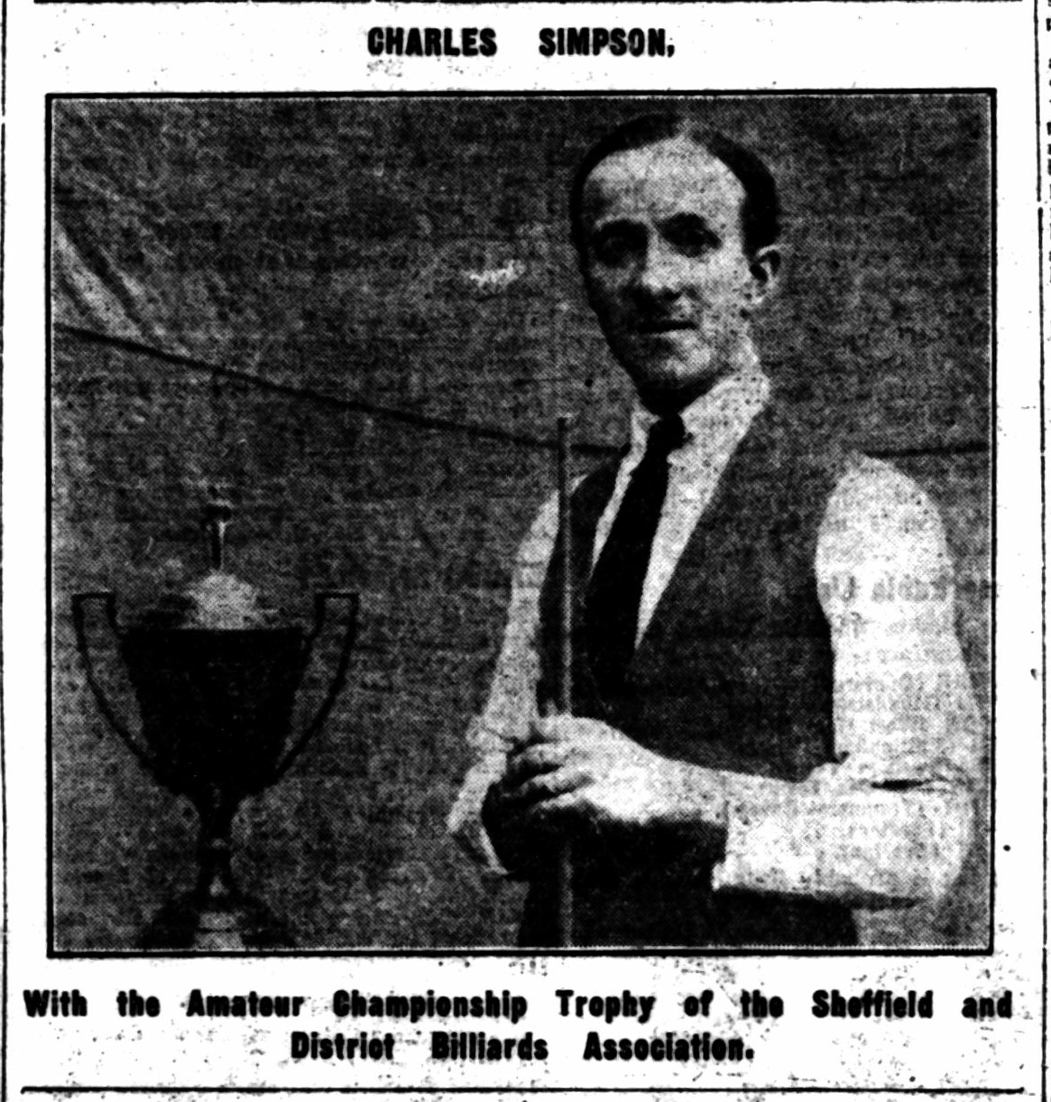 Charles was born in 1895 in Hillsborough Sheffield, the youngest son of James and Amelia Simpson. His elder brothers were Fred and Henry (Harry) who were eight and five years older than Charles. He also had an older sister Alice who was born two years prior to Charles. James Simpson owned a small billiard saloon on Walkley Lane Sheffield called the La Plata and it was here that Charles began his lifelong interest in billiards and snooker. In 1906 at the age of eleven he made his first fifty break as well as becoming the Sheffield Boys Champion. Three years later he was scoring breaks of one hundred.