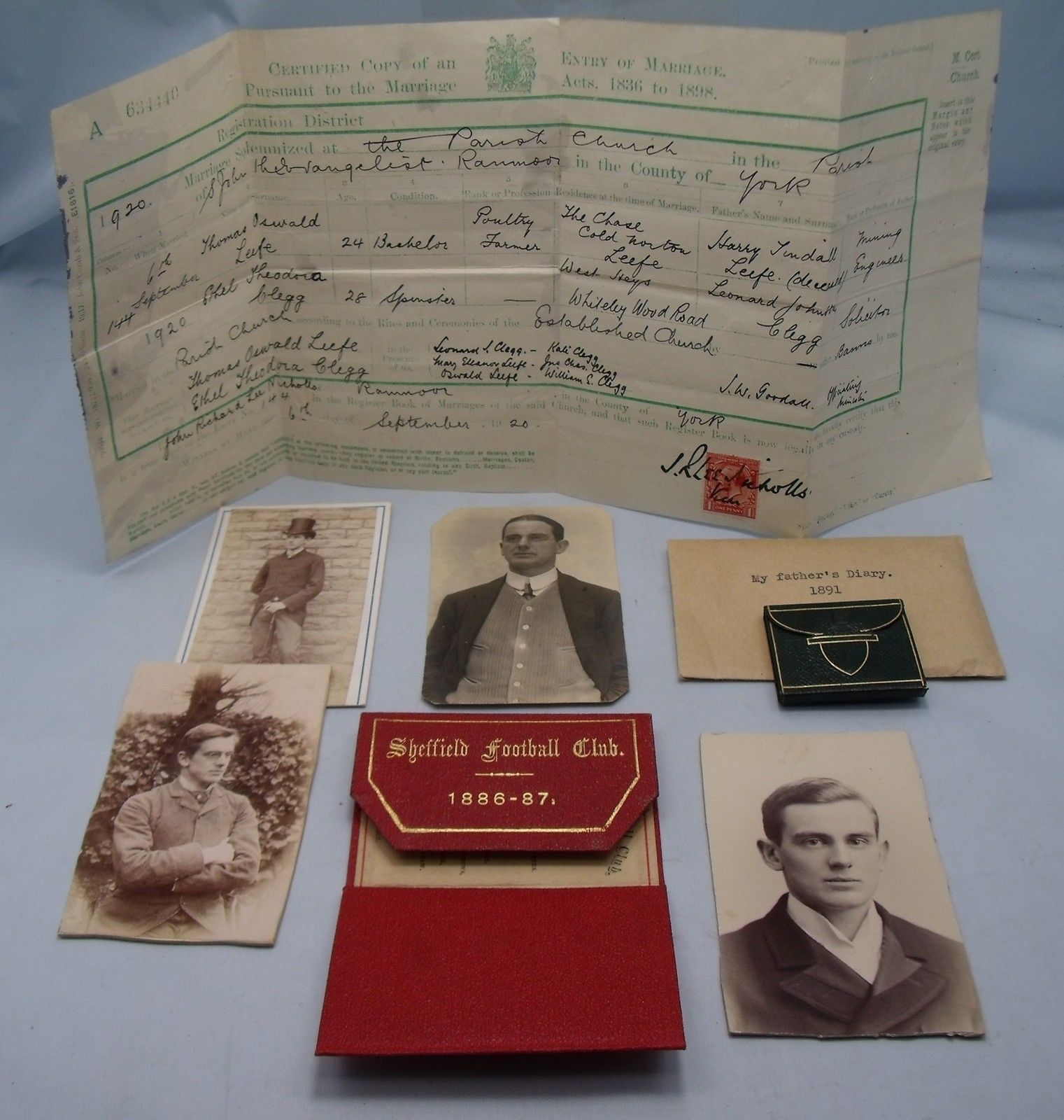 His Daughter Theodora's Marriage Certificate, Witnessed by Clegg, and his two Brothers - Charles, Sheffield Wednesday Footballer & President of the English Football Association, as well as being Chairman of both Wednesday and United (being a co-Founder) - and William, Sheffield F.C. & Wednesday Player, and fellow England International.