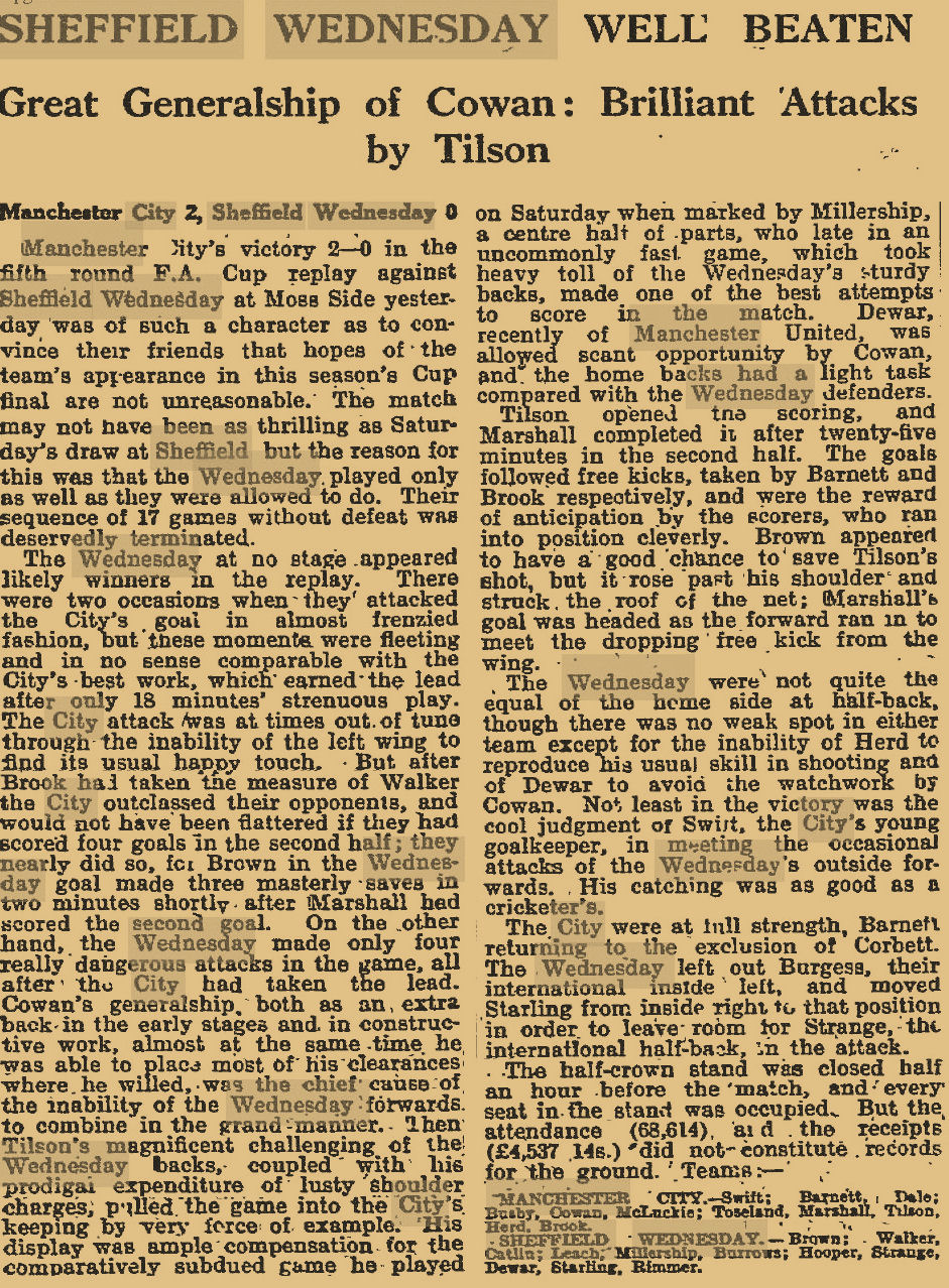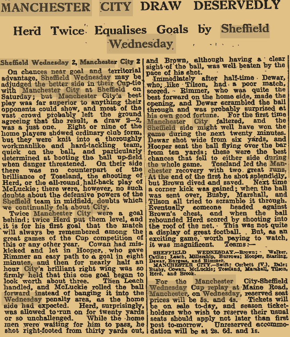 On Monday 19th February 1934, The Manchester Guardian gave the following report on the match which ended in a 2 - 2 draw
