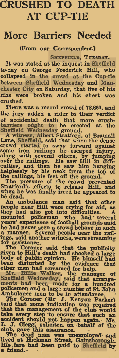 There is an excellent article in History Today that gives an overview of crowd safety at football games in the twentieth century - it is well worth reading as it fills in the background to Fred Hill's untimely death. The author notes