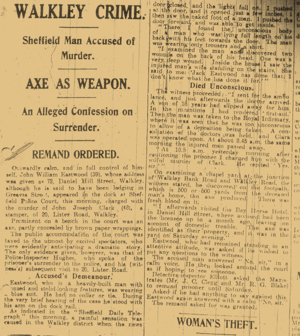 Attempts to save John Clark at the Royal Infirmary came to nothing and at 8.48 a.m. he was pronounced dead, the result of a savage head wound and fractured skull. Just over a hour later Eastwood was charged with his murder. The following day he appeared before City Magistrates and was remanded in custody. An Inquest on 31st July returned a verdict of wilful murder and issued the authority for the burial of Jack Clark. Three days later, on Friday 3rd August 1923 Jack Clark was laid to rest in Walkley Cemetery to the accompaniment of large crowds and an intrusive press. The local paper reported that a "A “painful sensation was caused in the Walkley district” [Star] - “Large crowds gathered in the vicinity of 20 Lister Road yesterday on the occasion of the funeral of the Walkley hatchet tragedy victim. There were many more people at Walkley Cemetery, the majority being women...After a short service the remains of Mr John Joseph Clark were taken to a grave at the lower end of the cemetery. Many of the spectators were greatly affected as the last rites were read.” [Sheffield Daily Telegraph 4th August 1923]