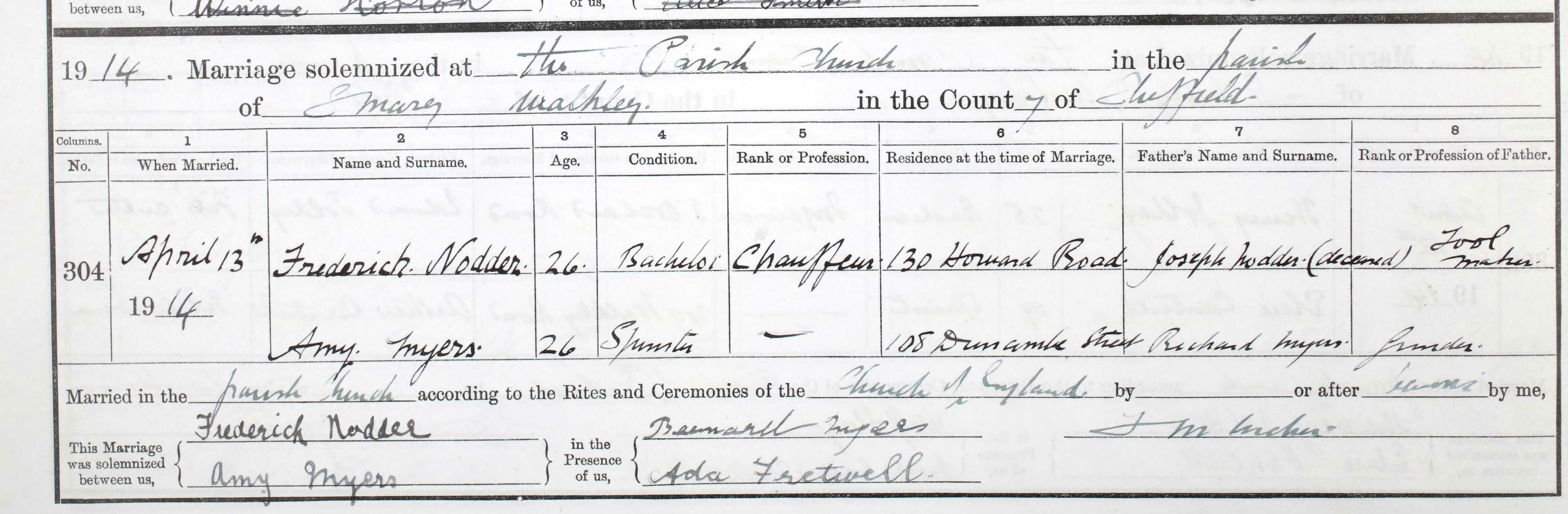 Frederick Nodder Head Male 1887 33 Sheffield, Yorkshire, England Motor Mechanic T Grestores Drife Dresser 8 Mitchell St Sheffield