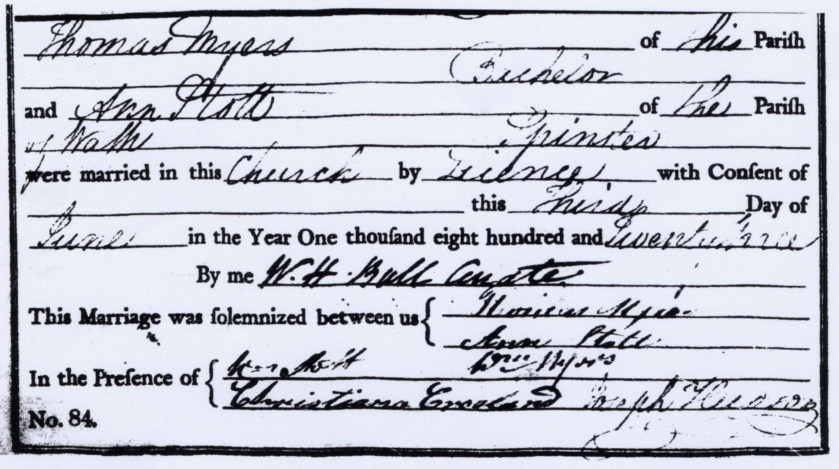 Marriage Certificate, Sheffield Parish Church (SS Peter & Paul) - Thomas MYERS of this parish. Bachelor and Ann STOTT of the parish of Wath Spinster were married in this church by License this third day of June 1823 by me W.H.Ball. Curate. Both signed Witnesses Wm ? STOTT. Wm MYERS. Christiana CROSLAND and Joseph HUDSON the last witness was a clerk of the church.