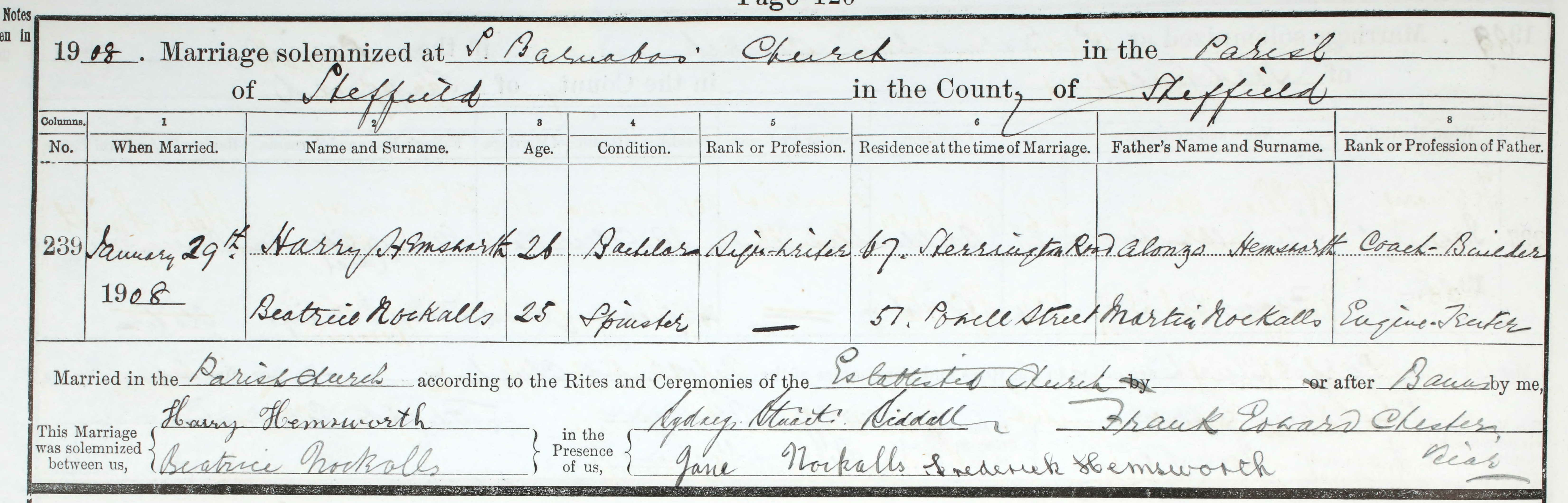 HARRY married BEATRICE NOCKALLS in the March quarter of 1908 (GRO reference Ecclesall Bierlow Volume 9C Page 468). Beatrice was 25 at the time of her marriage and was employed as a Dressmaker (1901 Census). She was the daughter of MARTIN (1856 - ) and FANNY NOCKALLS nee ROBINSON (1859 - ). Her mother Fanny was from Sheffield but her father Martin was from Norwich, Norfolk.