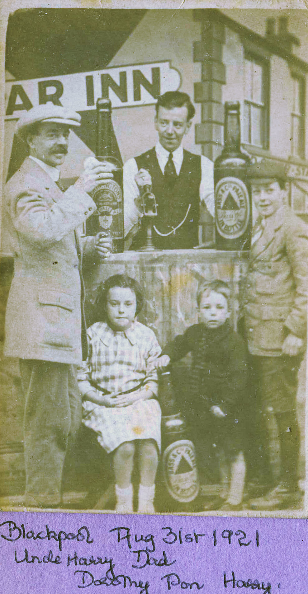 There is an excellent photograph that was taken on Wednesday 31st August 1921 in Blackpool. The man behind the bar is my grandad Sid. The man holding the glass with the unfeasibly large cap is his older brother HARRY.