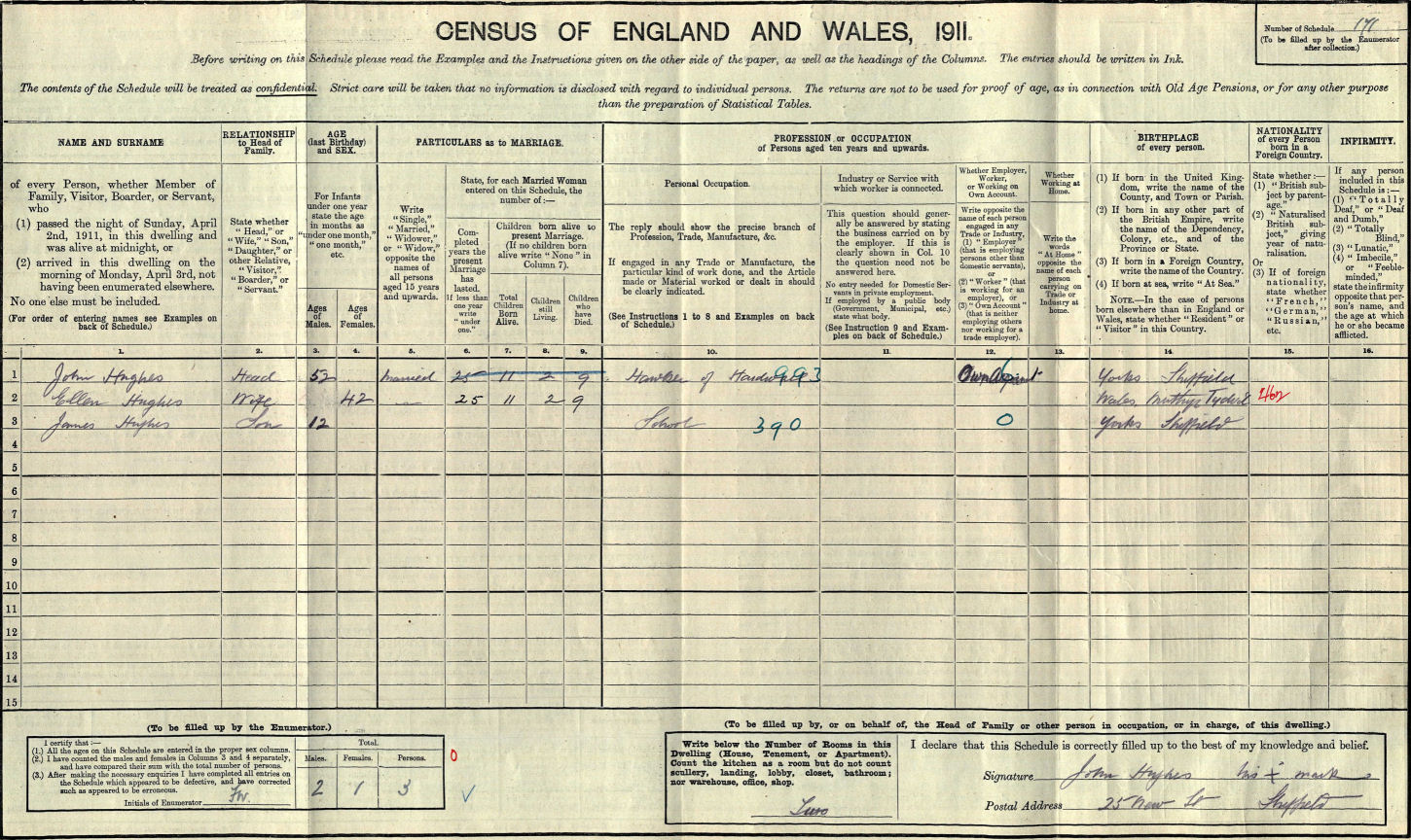 Superficially this could be Henry's family but to be certain I would need further information to verify them. Nevertheless three points on the census stand-out - firstly John was unable to read and write - he just placed his mark on the form and someone else must have completed it for him Secondly the family were living in just two rooms and finally their son James was living with them. There was another child that was still living (was this Henry who would have been 20 at the time of the census?) but was not resident at 25 New Street. John and Ellen had eleven children but only two were still living in 1911.