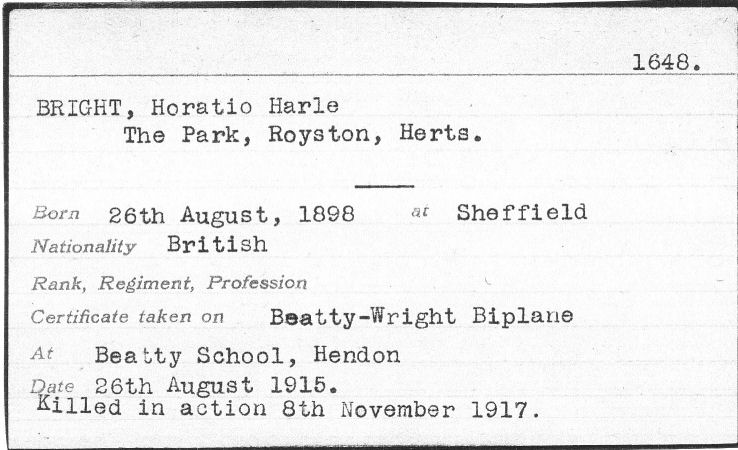 Horatio Harle Bright was born in Sheffield on 26 August 1898. He attended Sherborne Preparatory School and Marlborough and was still at school in October 1914. Volunteering for the RFC, he was instructed to join at Brooklands on 1st July 1915. He was posted to Netheravon on 11th August 1915 but the War Office did not realise he was only sixteen years of age! Correspondence passed between the Deputy Director of Military Aeronautics, Bright's father and the Royal Aero Club. His father wrote to the military, stating he would not attribute any blame upon the government if his son was injured, as long as he could continue flying. The Royal Aeronautical Club was prepared to issue Bright's 'ticket' if the War Office accepted him. In the event, the powers that be declined, and Bright's Royal Aero Club certificate, No. 1648, was issued on his 17th birthday, 26th August 1915. He graduated from CFC on 19th October and arrived in France on 29th October with a posting to 6 Squadron RFC.
