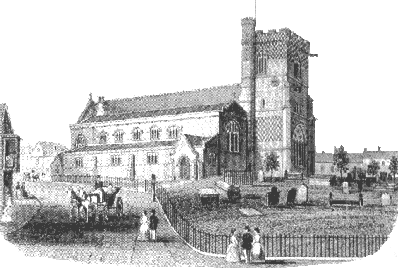 Barnet Church, St John the Baptist, which stands in what was the centre of the town, was erected by John de la Moote, abbot of St Albans, about 1400, the architect being Beauchamp. It consists of a nave and aisles separated by clustered colons which support four pointed arches; a chancel with an east window of good Perpendicular tracery; a vestry, built in the reign of James I by Thomas Ravenscroft; and at the west end, a low, square embattled tower. The living of Barnet is a curacy, held with the rectory of East Barnet till the death of the late incumbent in 1866, when the livings were separated. The town also includes parts of the parishes of Monken Hadley and South Mimms. - From James Thorne - The Handbook to the Environs of London (1876).