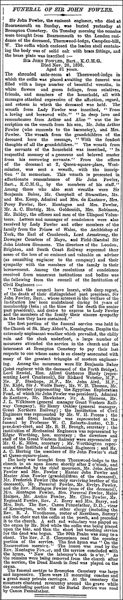 In 1890 John Fowler was created a baronet the year the Forth Rail Bridge opened. He died peacefully in Bournemouth on the 20th of November 1898 at the age of 81 after a long period of ill health