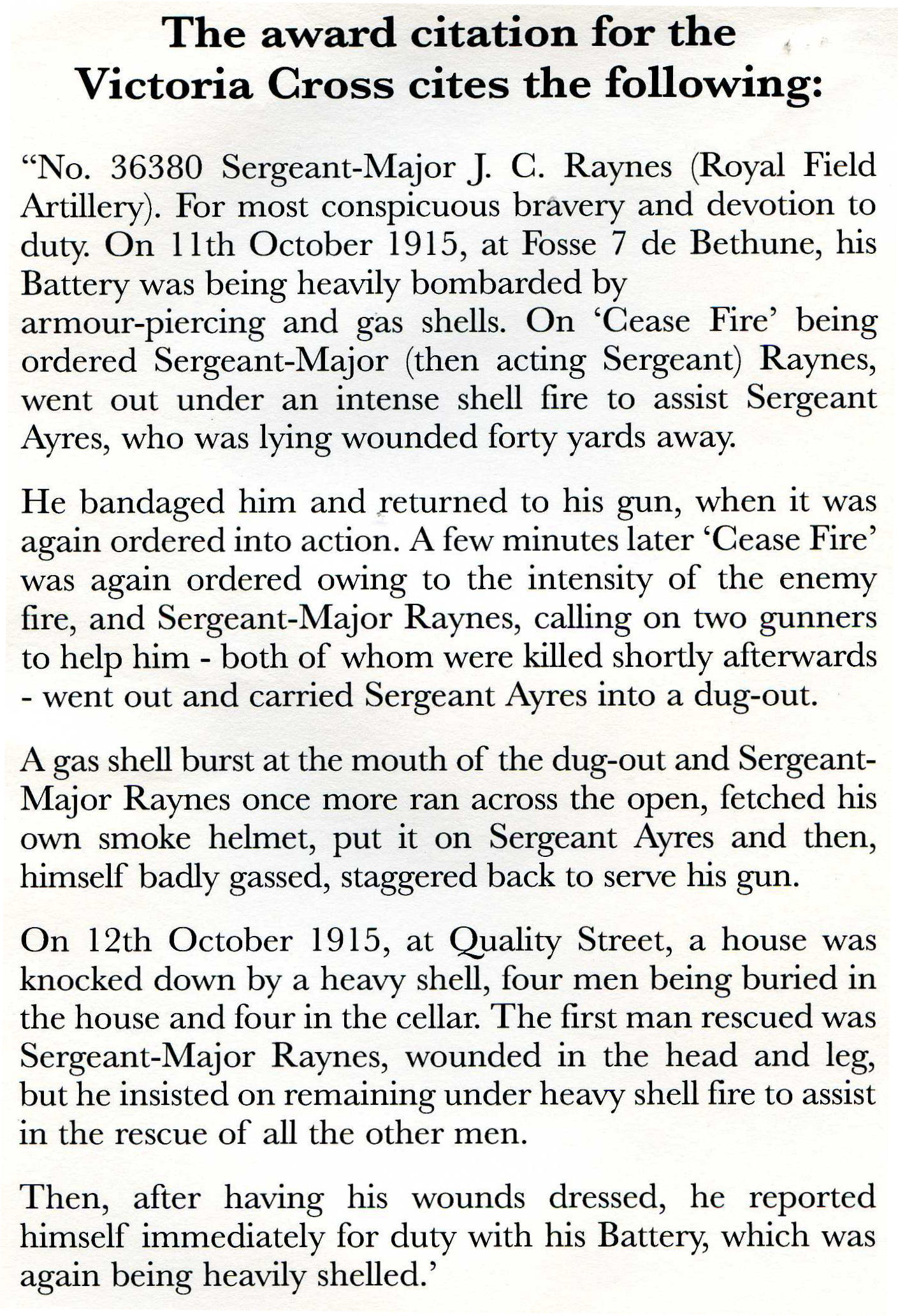 His VC citation read: "For most conspicuous bravery and devotion to duty. On 11th October, 1915, at Fosse 7 de Bethune, his Battery was being heavily bombarded... On cease fire being ordered Sgt Major (then Acting Sergeant) Raynes, went out under intense shell fire to assist Sgt Ayres, who was lying wounded forty yards away. He bandaged him and returned to his gun, when it was again ordered into action.