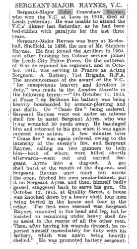 " Sergeant-Major John Crawshaw Raynes, who won the V.C. at Loos in 1915, died at Leeds yesterday. He was unable to attend the V.C.s' dinner last Saturday, as he had been bed-ridden with paralysis for the last three years. Sergeant-Major Raynes was born at Ecclesall, Sheffield, in 1886, the son of Mr. Stephen Ravnes. He first joined the Artillery in 1904. and after finishing his Colour service joined the Leeds City Police Force. On the outbreak of War he rejoined his regiment. and in October, 1915, was serving in France as Acting Sergeant, A Battery. 71st Brigade, R.F.A. The announcement, of the award of the V.C., "for conspicuous bravery and devotion to duty, was made in the London Gazette in the following terms:- `On October 11, 1915, at Fosse 7 de Bethune his battery was being heavily bombarded by armour-piercing and gas shells. On "Ceasefire" heing ordered, Sergeant Raynes, went out under an intense shell fire to assist Sergeant Ayres, who was lying wounded 50 yards away. He bandaged him and returned to his gun when it was again ordered into action. A few minutes later " Cease fie " was again ordered, owing to the intensity of the enemy's fire, and Sergeant Raynes, calling on two gunners to help him-both of whom were killed shortly afterwards-went out and carried Sergeant Ayres into a dug-out. A gas shell burst at the mouth of the dug-out, and Sergeant Ravnes once more ran across the open, fetched his own smoke-helmet, put it on Sergeant Ayres, and then, himself badly gassed, staggered back to serve his gun. On October 12, 1915, at Quality Street, a house was knocked down by a heavy shell, four men being buried in the house and four in the cellar. The first man rescued was Sergeant Raynes, wounded in the head and leg, but he insisted on remaining under heavy shell fire to assist in the rescue of all the other men. Then, after having his wounds dressed, he reported himself immediately for duty with his battery, which was again being heavily shelled." He was promoted battery sergeant- major and was discharged " physically unfit" in December, 1918. After his discharge Sergeant-Major Raynes returned to the Leeds police and was promoted sergeant. But it was only with great difficulty that he followed his duties; his health gradually grew worse, and three years ago he had to give up altogether. The new Lord Mayor of Leeds, 3Mr. N. G. Morrison, made it one of his first duties after his election to visit Sergeant- Major Raynes. He called and had a talk with him on Armistice Day. On that day, too, Sergeant-Major Raynes received a telegram from the other Yorkshire V.C.'s in London conveying their greetings and expressing their regret that he could not complete the party. He leaves a widow and family."