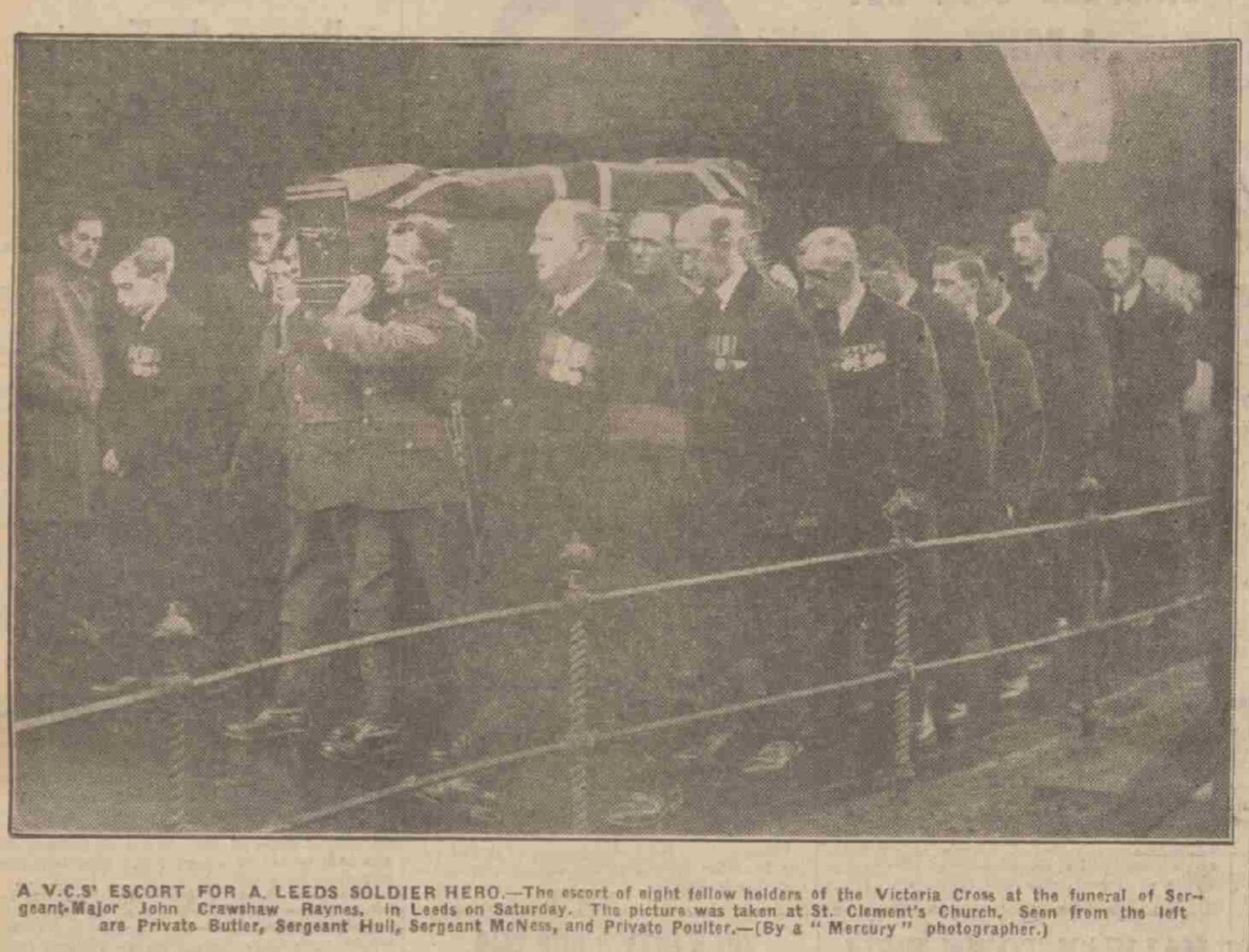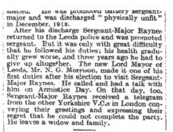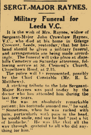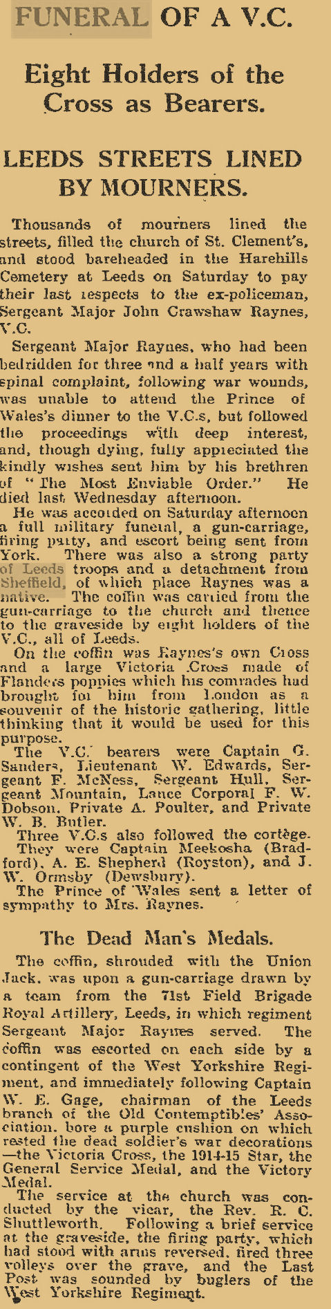 The funeral was held on Saturday at Leeds- of ex-Sergeant-Major J. C. Raynes, the Leeds V.C.. who was paralysed from War wounds and unable to attend the Prince of Wales's dinner. Between 25,000 and 30,000 people assembled. Eleven V.Cs were present, and full military honours paid. The other eight Leeds V.C.s acted as pallbearers. The coffin rested on a gun-carriage supplied with a team from the 71st Field Brigade R.A. and was followed by Captain W. E. Gage (chairman of the Leeds " Old Contemptibles "), who bore on a purple cushion Sergeant-Major Raynes's V.C., 1914-15 Star, General Service Medal, and Victory Medal. A wreath of Flanders poppies and evergreens in the shape of a Victoria Cross, which Lieutenant Edwards, V.C., brought from the House of Lords, had been intended as a souvenir. It bore the following message--" In affectionate memory from brother V.C.s of Leeds, who sorely missed their comrade at the Prince of Wales's dinner, whence this emblem was brought for him." The service at St. Clement's was attended by' the Lord Mayor and Ladv Mayoress of Leeds, the Chief Constable, and a squad of police. Last Post was sounded at Harefields Cemetery amid a dense crowd.
