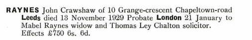 Two days later on Tuesday 12th November 1929 John died at his home in Grange Crescent, Chapeltown, Leeds at the young age of 42 leaving a wife and family.