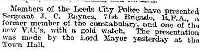 "was an old scholar of our Day and Sunday Schools, a member of our Boys' Brigade – Sergeant-Major J. C. Raynes, who, on his recovery, visited his old school, received a warm welcome from the vicar, teachers, and scholars, and in a simple, unassuming manner, after handing round his V.C. to the scholars, offered a few words of advice to the lads. He was severely wounded at Loos..."
