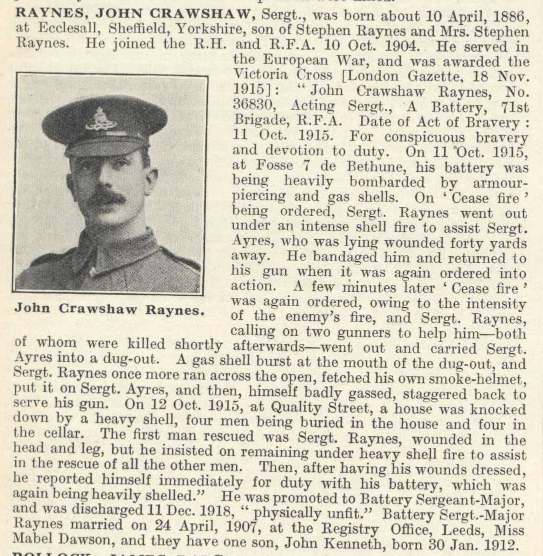 "No. 36380. Sergeant-Major J. C. Raynes, (Royal Field Artillery). For most conspicuous bravery and devotion to duty. On 11th Oct., 1915, at Fosse 7 de Bethune, his Battery was being heavily bombarded by armour-piercing and gas shells. On "Cease Fire" being ordered Sergeant-Major (then Acting Sergeant) Raynes, went out under an intense shell fire to assist Sergeant Ayres, who was lying wounded forty yards away. He bandaged him and returned to his gun, when it was again ordered into action. A few minutes later "Cease Fire" was again ordered owing to the intensity of the enemy fire, and Sergeant-Major Raynes, calling on two gunners to help him – both of whom were killed shortly afterwards – went out and carried Sergeant Ayres into a dug-out. A gas shell burst at the mouth of the dug-out, and Sergeant-Major Raynes, once more ran across the open, fetched his own smoke helmet, put it on Sergeant Ayres, and then, himself badly gassed, staggered back to serve his gun. On 12th Oct., 1915, at Quality Street, a house was knocked down by a heavy shell, four men being buried in the house and four in the cellar. The first man rescued was Sergeant-Major Raynes, wounded in the head and leg, but he insisted on remaining under heavy shell fire to assist in the rescue of all the other men. Then, after having his wounds dressed, he reported himself immediately for duty with his Battery, which was again being heavily shelled."