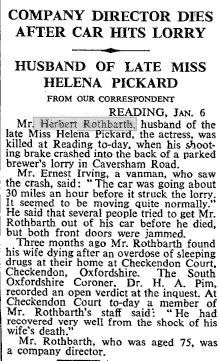 On the evidence that was presented to the Coroner, the verdict was a formality. Similarly it was the case with Helena's husband three months later. The Times states in it's edition dated 7th January 1960 that he died when he crashed into the back of a stationary brewer's lorry. The same paper reported on 13th January that the Coroner had returned a verdict of accidental death
