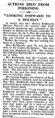 In April 2012 I had another attempt to ascertain the details of both these deaths. The Times newspaper did thankfully carry a report of the Inquest. In its edition dated 8th October 1959 there is this account of Helena's death