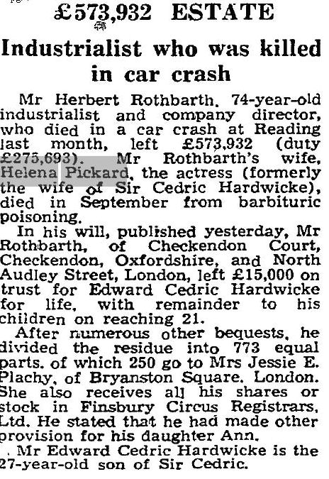 Helena did remarry but unfortunately I only know this on account of her Obituary that appears in The Times dated Monday September 28 1959 (page10 Issue 54577). MRS H. ROTHBARTH (actress Helena Pickard) the former wife of Sir Cedric Hardwicke died yesterday (September 27 1959) at her home Checkendon Court near Reading. She was 59. The following day The Times ((page17 Issue 54578) gave a fuller obituary of Helena that is produced below