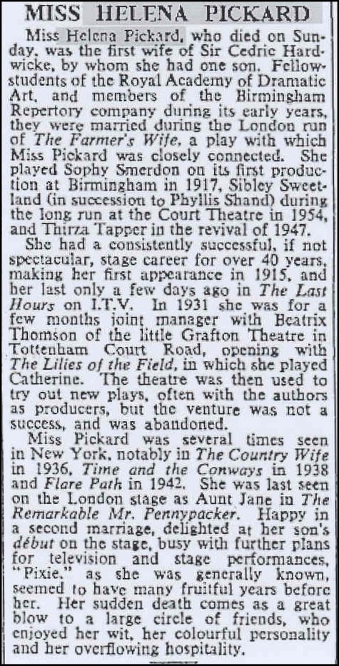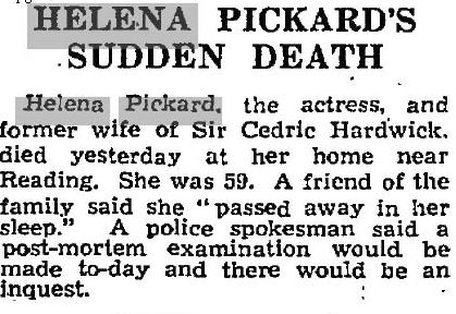 Five years after the divorce Helena was in the news again. The Times dated Wednesday 28th September 1955 (page5 Issue 53337) reported a "£3,000 Jewel Theft at Actress's Flat.". It reported that "Jewellery valued at about £3,000 was stolen on Monday night (26th September 1955) from the flat in Aldwych,WC, of Lady Hardwicke - Helena Pickard the actress, the former wife of Sir Cedric Hardwicke. "Everything of value has gone" she said yesterday. It is believed that entrance to the flat was gained from a fire escape on the roof."