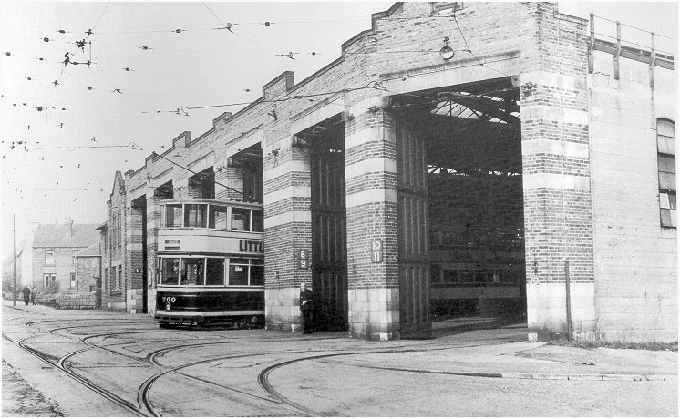 The Tramshed at Crookes was one of six depots that were located throughout Sheffield that were built to service and maintain Sheffield's fleet of over four hundred trams. Designed by F.E.P. Edwards the City Architect, construction on the sheds started prior to 1914 on the site of an old brickyard but, due to the onset of war, the work was not fully completed until 1919. Above the first gate on a Queen Anne Gable is the inscription "SCT1919" but in fact the sheds did not actually open until a year later. Like other sheds in the city it was built at the end of a route since the first and last traffic is generally inward and outward. The sheds remained operational until the tram system was withdrawn in 1960. The above photograph was taken in 1957 and shows the tramcar 200 entering the Depot.