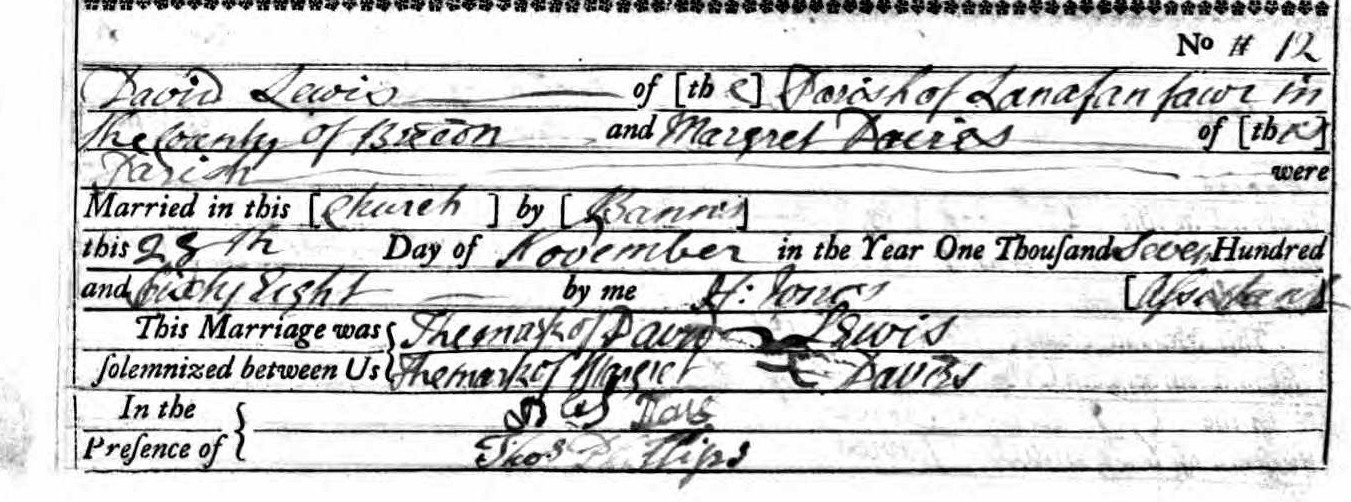 "Banns of Marriage between David Lewis of the parish of Llanafan Fawr and Margaret Davies of this parish were published on the three Sundays underwritten. That is to say 30th October, 6th November,13th November 1768"