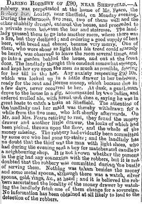 DARING ROBBERY IN YORKSHIRE. __ A robbery of a most daring character was perpetrated on the evening of Monday last at the house of Mr. Fearn, of the Rodney Inn, Loxley, near Sheffield. During the afternoon five strange men, two of them well and the other shabbily attired, entered the house, and proceeded to a little private room between the bar and the staircase. They called for a good supply of best beer, with bread and cheese, and politely declined all the suggestions of the landlady to join the company in another room, where there was a comfortable fire. They replied that they should be extremely comfortable where they were, and shortly became very jovial - almost uproarious, one of them, at intervals, singing songs which his friends loudly applauded. One of the men, however, was observed to manifest great restlessness, and proceed several times into a little garden at the back of the house, and also out of the front door. Mrs Fearn thought the conduct of her guests somewhat strange, and feeling some uneasiness about the contents of her till in the bar kept an eye upon them. Locked up in a drawer in her bedroom were 49 sovereigns, one half-sovereign, one 10/- note, six /- notes, and about 20s in silver, making in all 90/- 10s, accumulated against the rent and license day; but no idea of danger with regard to this sum ever crossed her mind. Just at dusk a gentleman drove to the door in a gig, accompanied by two ladies, and, alighting in a great hurry, ordered "mulled" ale, with bread and cheese, to be ready as quickly as possible, representing that he was anxious to catch a train at Sheffield. In the bustle of attending to the new arrivals the attention of the landlady and her maidservant (the only persons in care of the house at the time) was withdrawn for a while from the suspicious customers in the private room. The five men left shortly afterwards, and on retiring to bed a few hours later Mr and Mrs Fearn, found that their bedroom had been entered by thieves. Two little drawers, belonging to a set, were lying on the floor, with the greater part of their contents strewn about, and the 90/- 10s, previously locked up in one of them, had been taken away. The aged couple were in great distress at their loss. It appears that the restless customer above referred to had during the evening sent a little boy for a farthing candle and a box of lucifer matches, and several matches were found scattered about the bedroom. The only article taken besides the money was a bag containing metal spoons, although there was a watch lying on the drawers and several gold rings in them. It is supposed that the thieves ascertained the locality of the money drawer by watching the landlady fetch one of them change for a sovereign during an early period of the evening. It is mere matter of suspicion as to whether the gentlemen and ladies who drove up in a gig were connected with the robbers, but little doubt is entertained that the robbery was committed while they were in the house by the restless man, who, having on boots so worn and light that his tread could scarcely be heard would be able to glide noiselessly upstairs unobserved during the bustle. No information has yet been obtained at all likely to lead to the discovery of the thieves. |