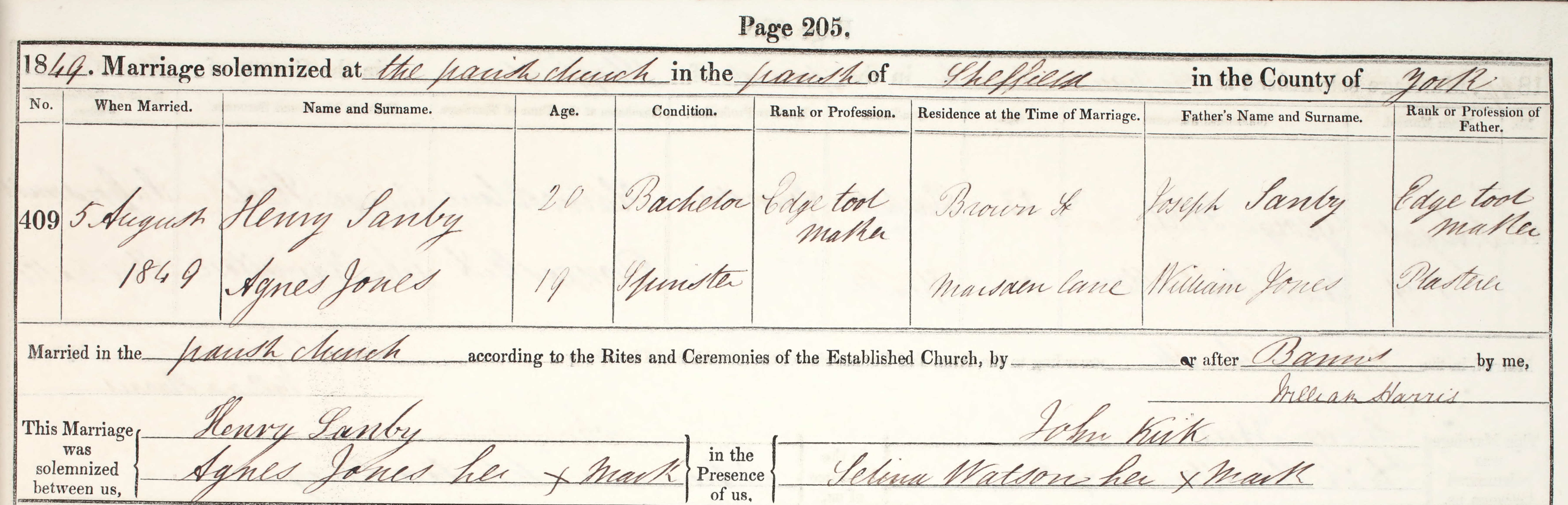 There is a record of HENRY and AGNES SANBY's marriage at The Parish Church of St Peter and St Paul (now Sheffield Cathedral). They were married in the September quarter of 1849 (Sheffield GRO Ref Vol 22 Page 497). The record shows that AGNES's maiden name was JONES. The marriage certificate shows that Agnes was the daughter of WILLIAM JONES, a plasterer of Marsden Lane, Sheffield. She was nineteen when she married. HENRY was a year older than Agnes and his occupation is given as Edge Tool Maker. the is the same occupation as his father JOSEPH SANBY. The address is given as Brown Street, Sheffield.