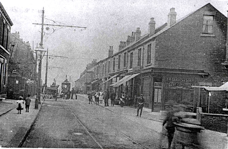The photograph was taken in 1906 and shows South Road. The road on the right is Freedom Road and the pub on the left is the Freedom House. My great great grandfather HENRY SANBY lived in the houses to the right of the photograph. In the late summer of 2005, I ascertained that HENRY SANBY lived until he was 77 years of age, dying in the December quarter of 1906 (PRO Ref Death Ecclesall Bierlow Vol 9C page 194)