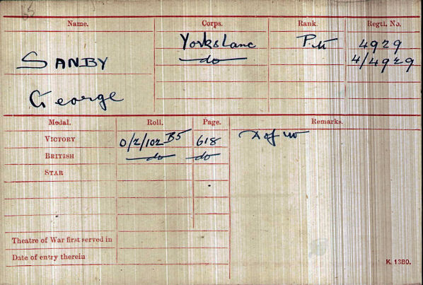I know very little about the life and indeed the death of Private G Sanby. The 1901 census just states that he is a 15 year old wood turner living with his parents JOSEPH and JANE SANBY in some slum in Sheffield's Park district.