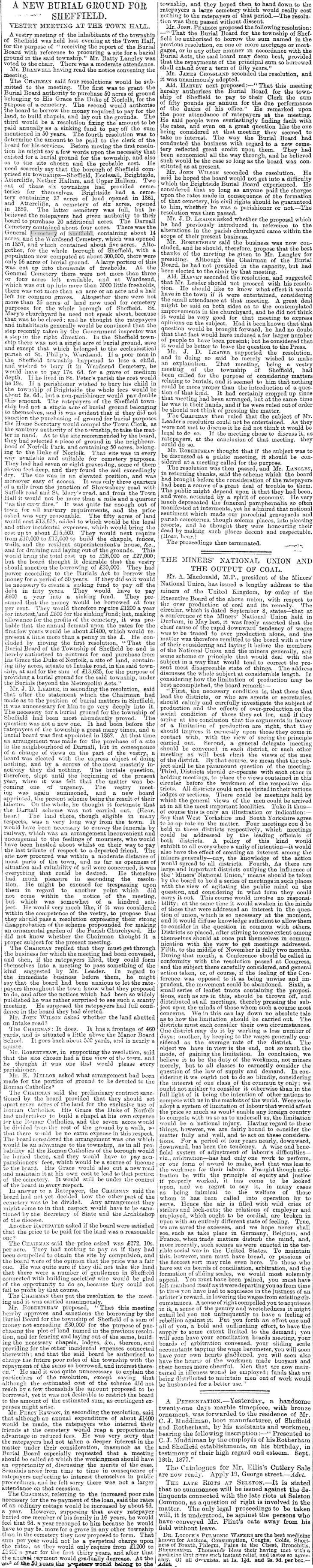 The Sheffield and Rotherham Independent dated 19th September 1877 had a far more detailed report of the meeting. Mr. Batty Langley who was voted to the Chair by the "moderate attendance" gave an rather damming review of the state of the burial grounds in the Townships before proceeding to the business in hand.