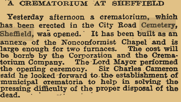 According to the information on Council's website, "the first cremation at City Road took place on 24th April 1905. The newly completed crematorium was only the tenth to be built in the UK. The service in remembrance of Eliza Hawley from Upperthorpe, Sheffield was attended not only by her family but by many other interested parties. The Town Clerk, the architect that designed the crematorium and even Mrs Hawley’s medical attendant came. It was reported that the service took 90 minutes to complete. Following the cremation, Mrs Hawley’s remains were placed in a niche in the 'columbarium', where they remain to this day".