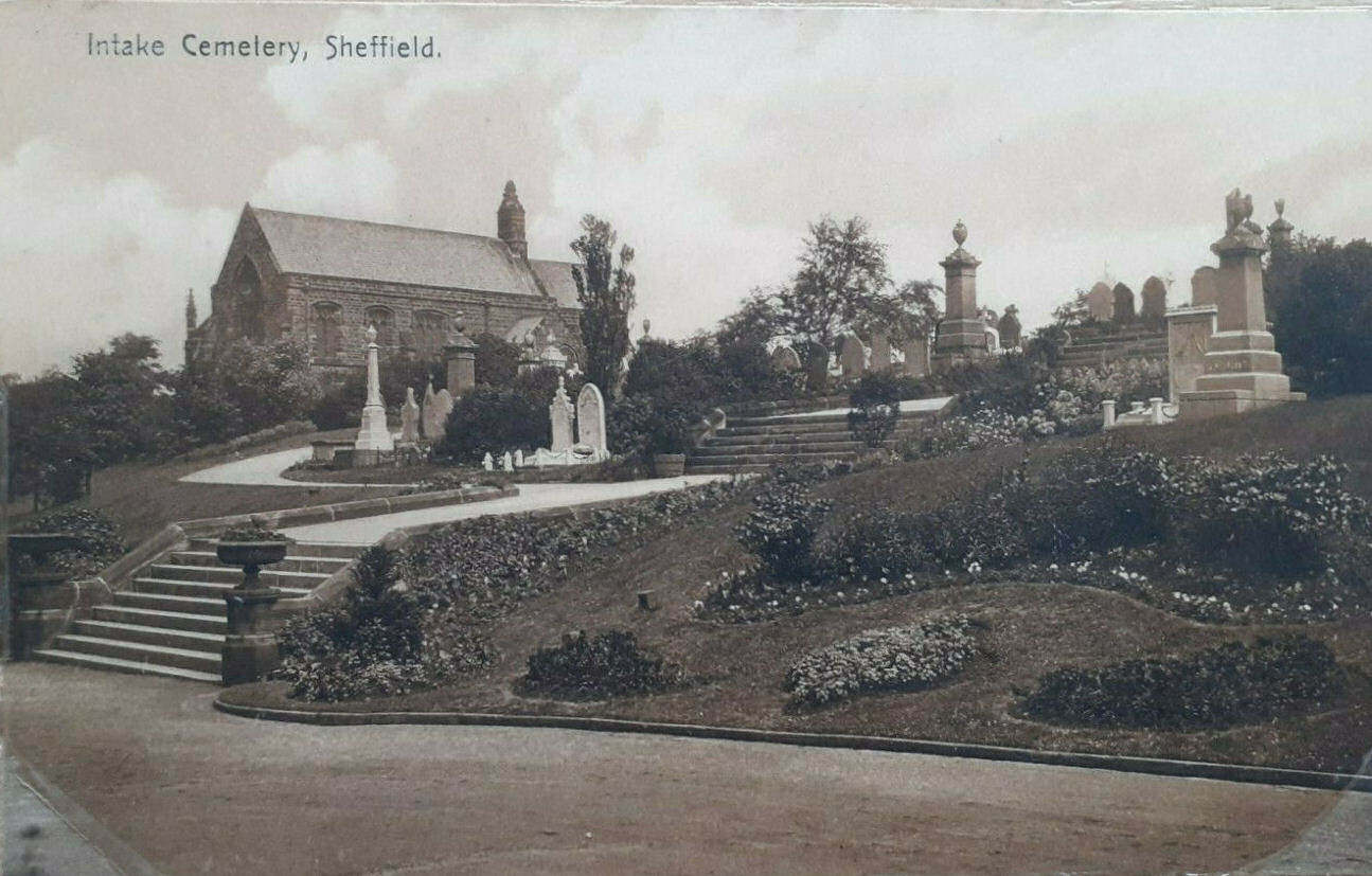 "Intake Road cemetery extending from Intake Road, (renamed City Road in 1898) up the hill towards Manor Lodge, and opened 26th May 1881 at a cost including buildings of about £50,000, consists of fifty acres of land, purchased by the Sheffield Burial Board from the Duke of Norfolk, for a sum of £13,625 and is intended for the joint use of members of Church of England, Non - Comformists, and Catholics At the principle entrance from the Intake Road is a tower 120 ft high containing a clock with chimes There are two chapels of stone, in the Tudor Gothic style from designs by Mssrs. M E Hadfield, and son, architects The cemetery includes a porters lodge and waiting rooms and is surrounded by a wall seven ft. high