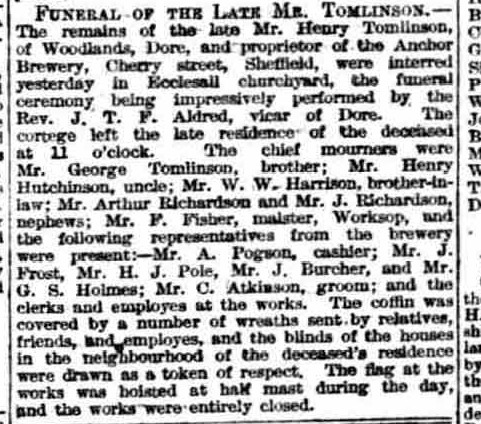 The papers Freeman's Journal and Daily Commercial Advertiser (Dublin, Ireland), Saturday, June 20, 1891; and The Belfast News-Letter (Belfast, Ireland), Saturday, June 20, 1891 both carried a report on the death of Mr Henry Tomlinson, proprietor of the Anchor Brewery Sheffield which at the time was one of the largest in the region