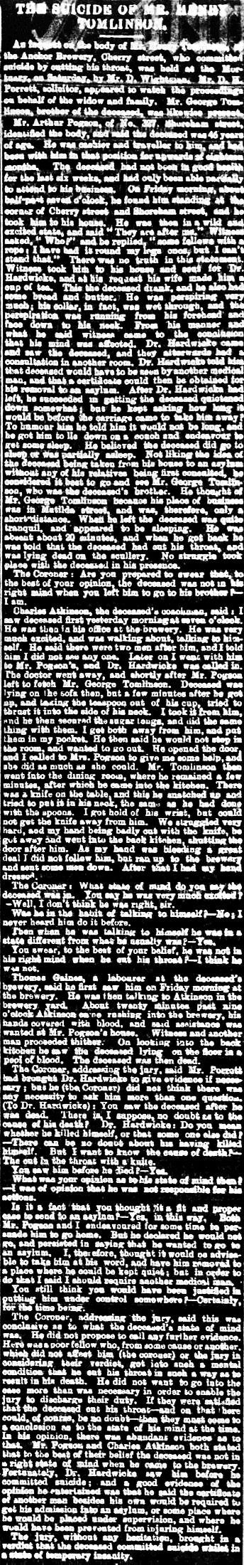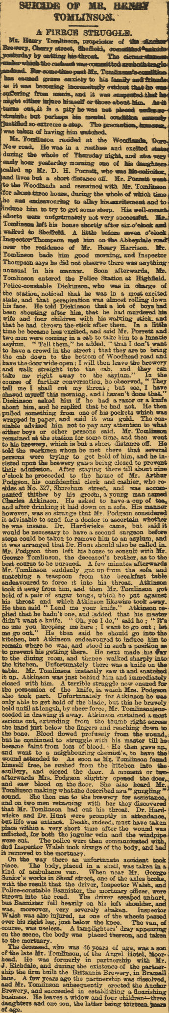 Yesterday morning, Mr. Henry Tomlinson one of the largest brewers in Yorkshire and proprietor of the Anchor Brewery Sheffield committed suicide by cutting his throat. Mr. Tomlinson had not been well for some time, and recently had been watched. His manner for the last day or two had been strange and yesterday morning on arriving at the brewery, his actions led everyone to believe that he was not in his right mind. He was taken to the house of his cashier and whilst the latter went to see Mr Tomlinson's brother, the deceased got a knife out of the kitchen A fierce struggle took place between the suicide and his coachman but by a terrible effort the deceased pulled the knife out of the coachman's hand so badly that he fainted through loss of blood. On getting free Tomlinson rushed into the scullery and forcing the knife into his throat made a terrible gash, the jugular vein and the windpipe both been cut. Death occurred in a few moments. Deceased leaves a widow and four children