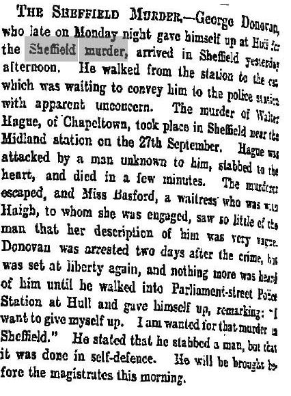 Between 11 and and 12 o'clock Monday night a man giving the name of GEORGE DONOVAN went to the Parliament-street police station, Hull and told the sergeant in charge that he had come to give himself up on the charge of murdering WALTER HAGUE at Sheffield on the 27th September, and for which he was wanted by Sheffield police. He said he was a marine foreman and was 38 years old. He further stated that he had been in Hull about a week, seeking a berth on a ship but had failed. In reply to interrogations he stated that he went from Hull to Sheffield on a visit, and met a woman with whom he became friendly. He bought he a hat or a bonnet and they intended to proceed to Hull together by the night train. He ad a lot to drink but they proceeded towards the station quietly together. Suddenly he missed his companion and going as directly as he could to the Midland Station he thought that he saw the woman that was to accompany him in company with another man. He promptly went forward to renegotiate with her whereupon her companion resented his intrusion and, as far as he could see, intended to follow it up with forcible methods. Upon this, and purely in self defence, and with no idea of doing serious injury to the man, he drew his knife and stabbed him. He lost his hat in the struggle and remained in Sheffield overnight. The prisoner then went on to state that he afterwards went on to Hull and the consciousness of the crime so worried him that he thought it would be best to give himself up to the authorities and have the matter put an end to.