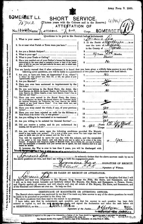 Lorraine volunteered at the beginning of the war and gave his age as being 19 years 286 days. This is clearly incorrect for the FreeBMD states that Lorraine was born "Births Mar 1897 Lax Lorraine Sheffield Volume 9c Page 691". It is my contention that Lorraine (like many others) was underage when he joined up, and so he just added two years on to his real age to ensure that he would be accepted.