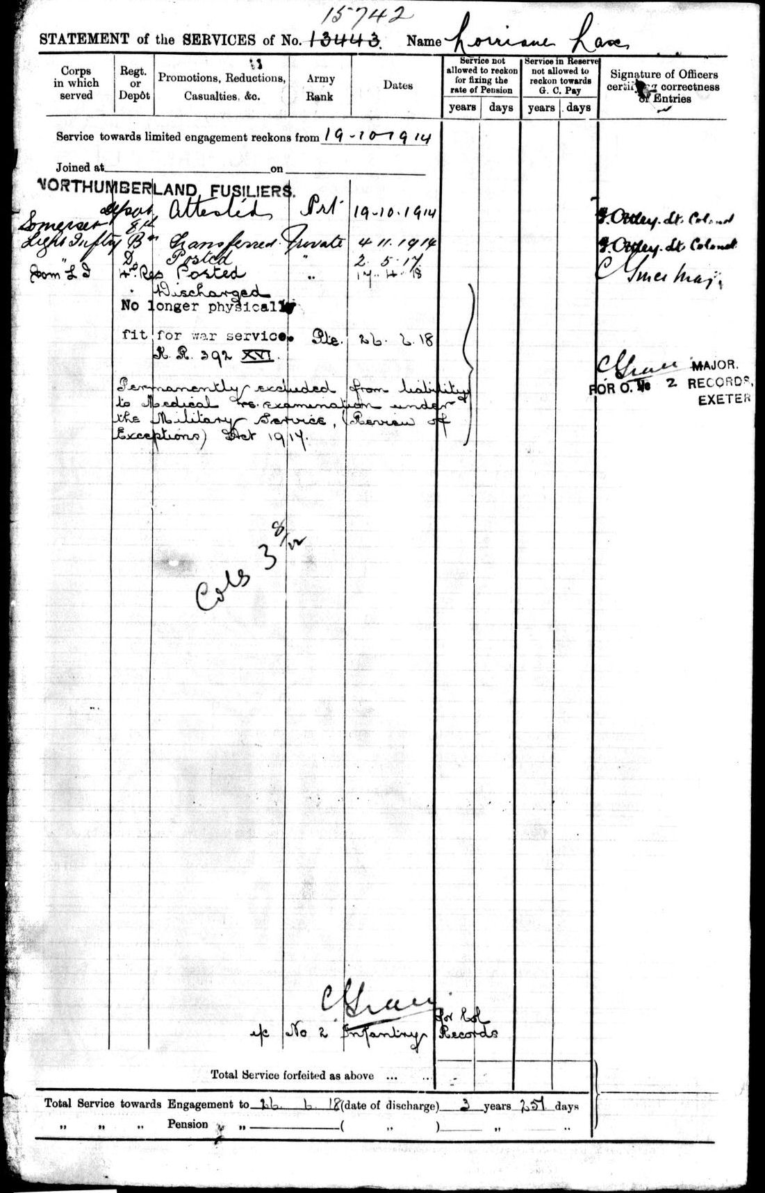 He was initially posted to the Northumberland Fusiliers but within a matter of days this was changed to the 8th Battalion, Somerset Light Infantry, and it was with the Somerset's that he remained, spending 3 years and 257 days under the colours before he was discharged on 26th June 1918 as "being no longer physically fit for war service"