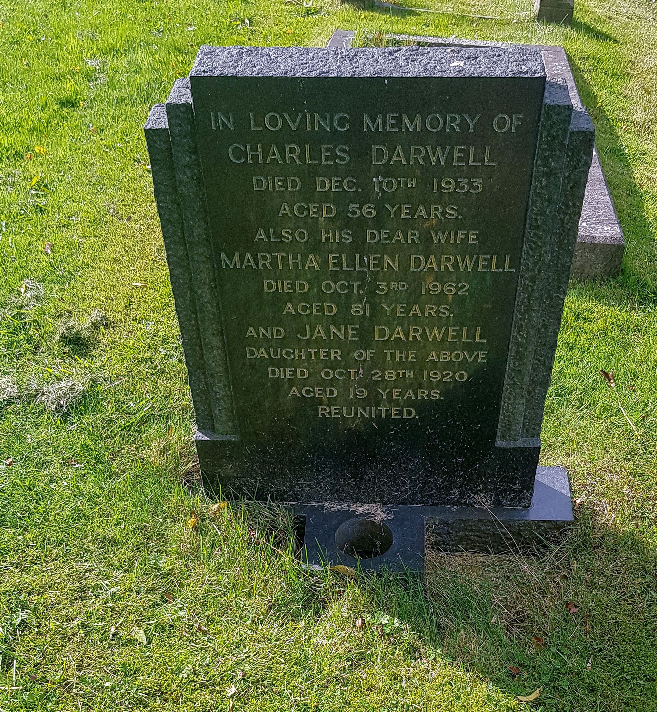 In loving memory of Charles Darwell died Dec 10th 1933 aged 56 years. Also his dear wife Martha Ellen Darwell died Oct, 3rd 1962 aged 81 years, and Jane Darwell daughter of the above died Oct. 28th 1920 aged 19 years. Reunited.