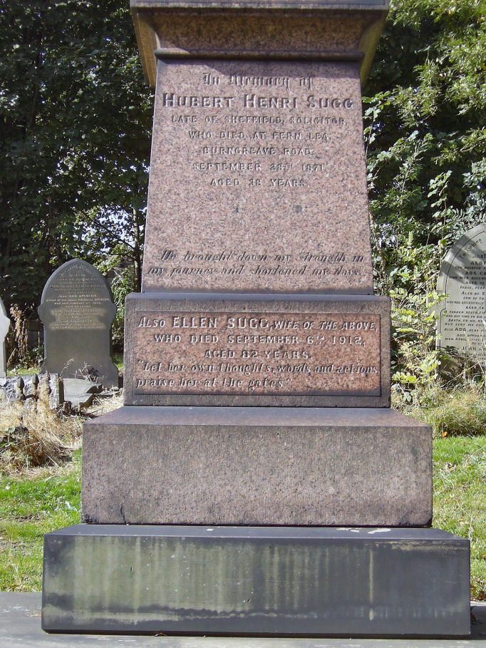 The monumental inscription refers to HUBERT HENRI SUGG who died in September 1871 at the age of 38. I checked the burial records for Burngreave Cemetery and found some additional information