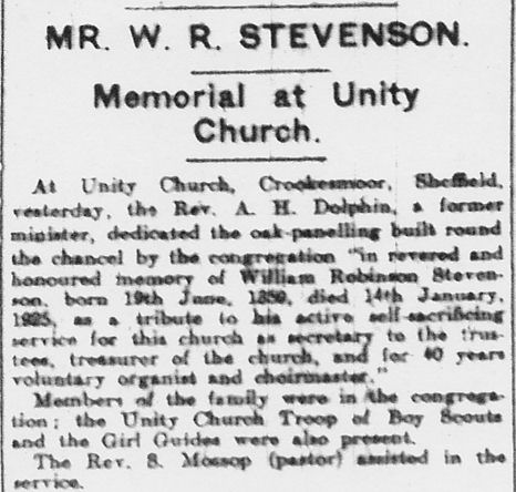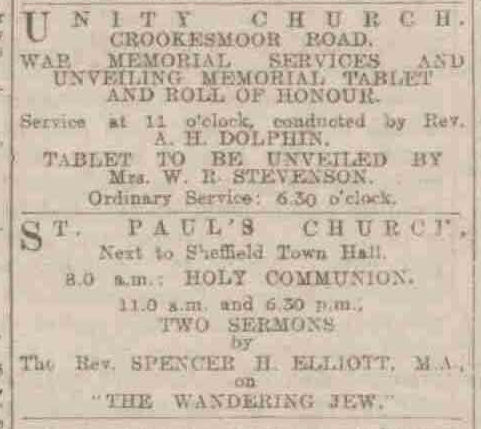 The above cutting is from the Sheffield Daily Independent dated 11th September 1920 and refers to the unveiling of a memorial tablet and roll of honour I have been unable to ascertain the current whereabouts of both the memorial tablet and roll of honour