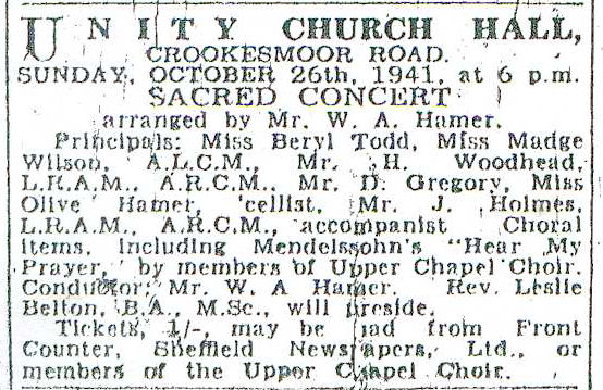 The Rev A H Dolphin in tracing the history of the congregation said its foundation in 1859 was due to the Upper Chapel and its then minister the Rev Brooke Hereford. That pastor and Mr Wollen whose work is commemorated by a window in the church at first chose a disused joiners shop in Penistone Road. Two years later they built the Upperthorpe Chapel. The congregation succeeded fairly well for some years but gradually the families supporting it moved away from the neighbourhood and eventually it was felt that the work could be better done, and with more hopeful prospects in another district. The present site recommended by the late Councillor Fox was bought 10 years ago. Several persons who were present at the opening of the Upperthorpe Chapel were still with them - Mrs Kirke, Mr and Mrs Alfred Beckett were among these, and others there who had not sent in their names. He wished to thank all who had taken part in bringing to an end the building of a house worthy of their cause.