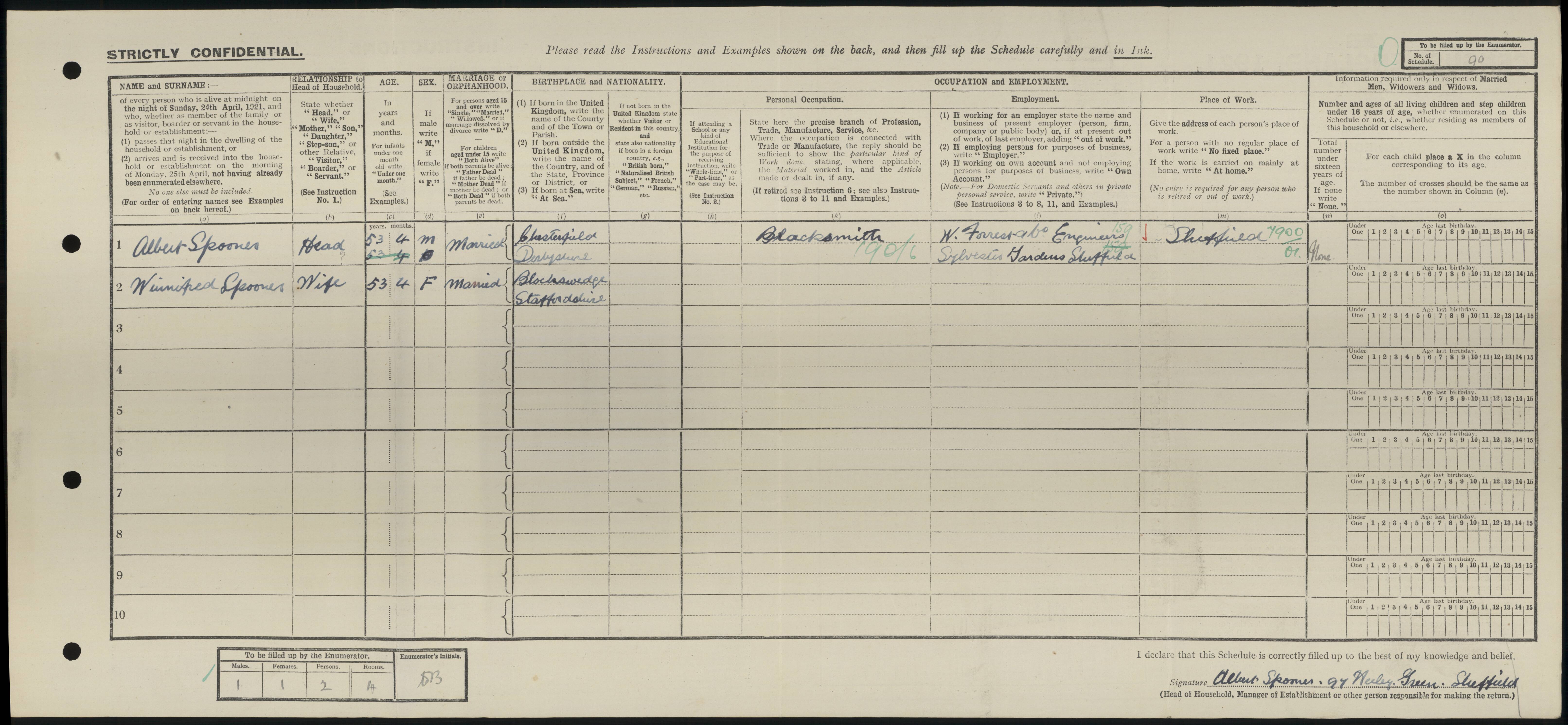 Name Albert Spooner Relation to Head of Family Head Age Last Birthday 33 Sex Male Profession or Occupation Blacksmith Condition as to Marriage Married Where Born Derbys Chesterfield Address 57 Denmark Rd Civil Parish Heeley Rural District Town or Village or Hamlet Ecclesiastical Parish Christ Church Parliamentary Borough or Division Attercliffe County Borough, Municipal Borough or Urban District Sheffield Administrative County Yorkshire Ward of Municipal Borough or Urban District Nether Hallam