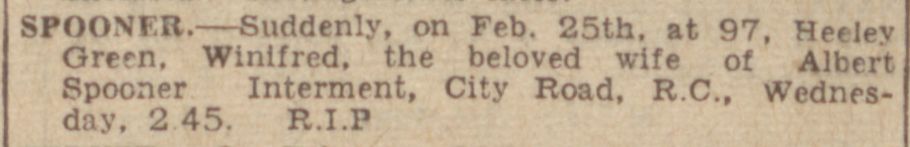 Spooner, Winifred (wife of Albert, age 71). Died at 97 Heeley Green; Buried on March 1, 1939 in Roman Catholic ground; Grave Number 4894, Section HH of City Road Cemetery, Sheffield.