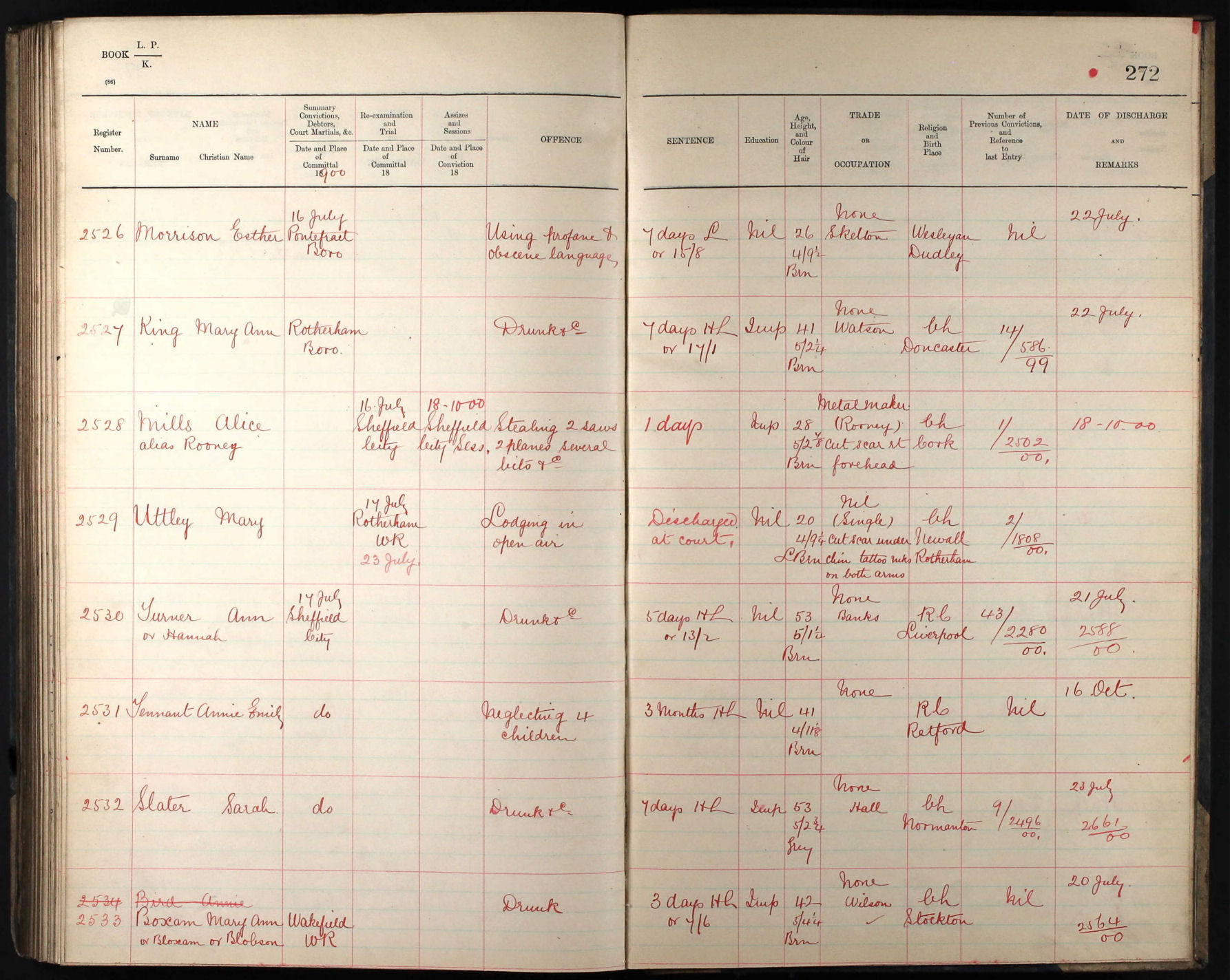 The admissions book of Wakefield Prison - Annie Emily Tennant's entry is third from the bottom entry no 2531