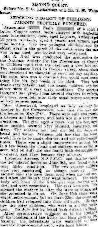 The evidence of the medical gentleman seems to be rather contradictory when he said that there was no disease apart from rickets to account for the death and the usual signs of starvation were not present. But young Ernest had an attenuated bowels and an emaciated body - his parents admitted and were sentenced for child neglect, part of which was down to the frequent lack of food. Whilst I agree with the Coroner's remarks regarding murder, I would argue that there was a possible case for manslaughter - it should have been tried in court