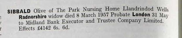 The final record is from the National Probate Index which records that Olive died on 8th March 1957 aged 79. She outlived her husband by nearly 37 years